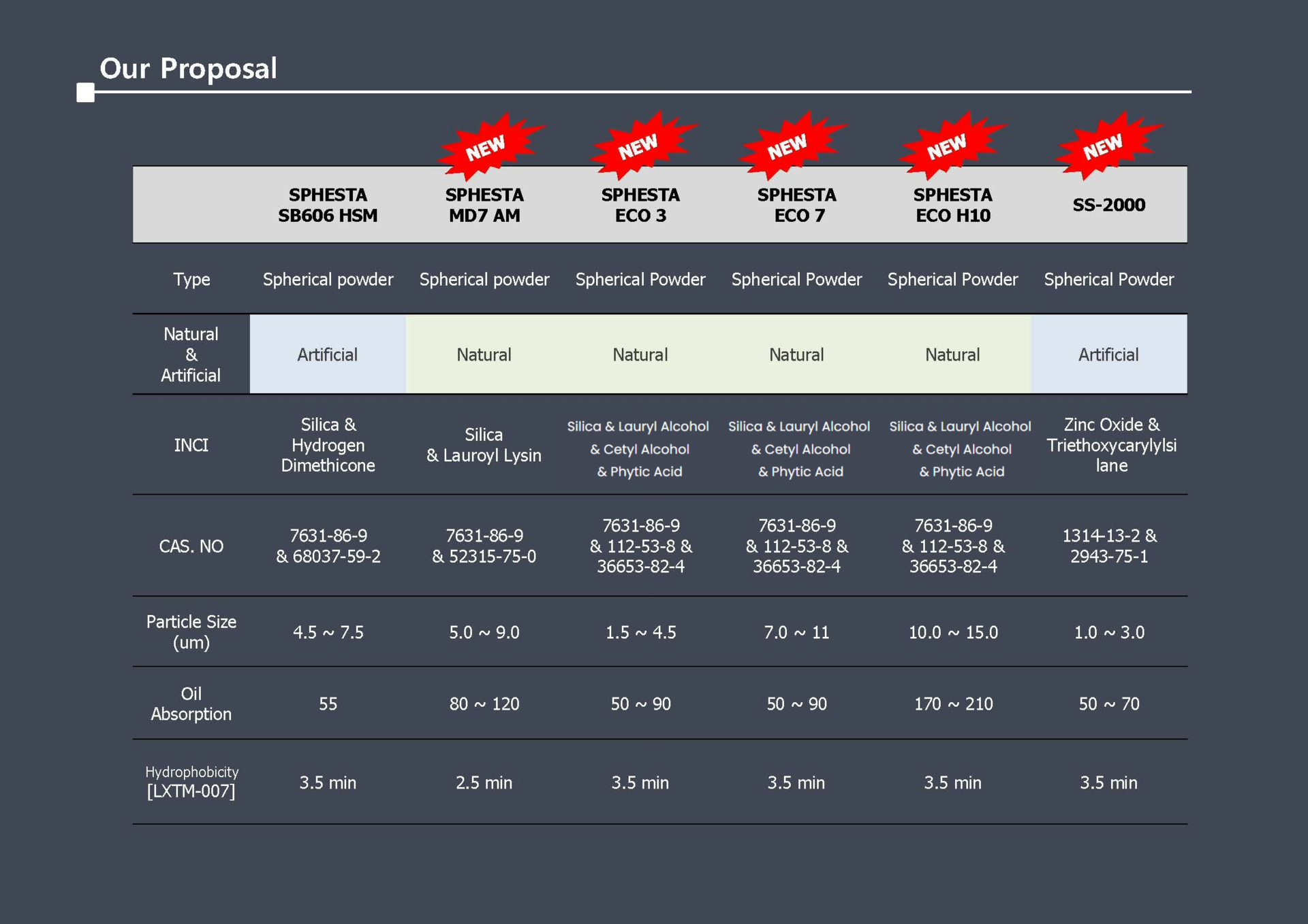 | SPHESTA ECO 7 | Silica & Cetyl Alcohol & Phytic Acid | D50 : 7.0~ 11 um OA : 50~90 | |